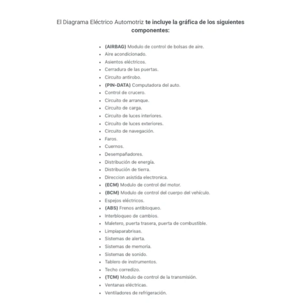 El Diagrama Eléctrico Automotriz te incluye la gráfica de los siguientes componentes: