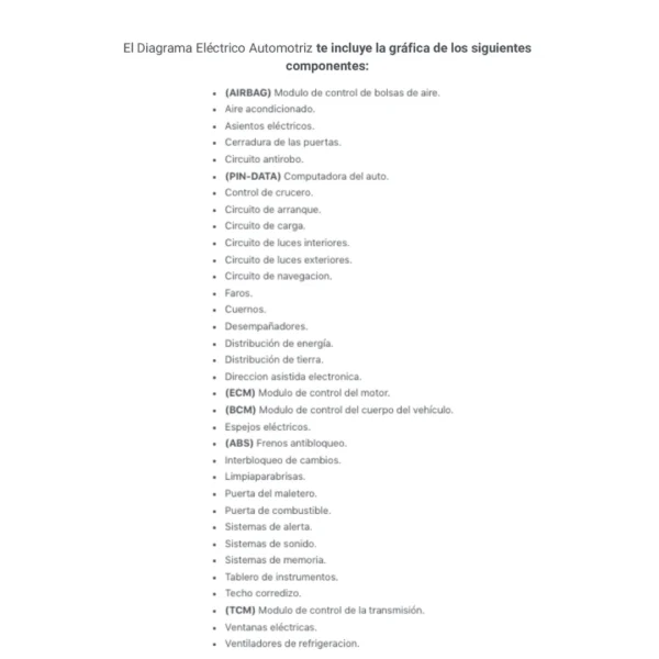 El Diagrama Eléctrico Automotriz te incluye la gráfica de los siguientes componentes: