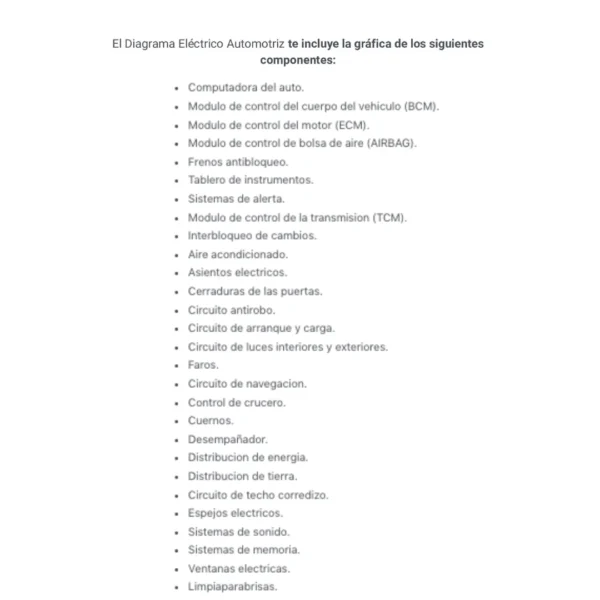 El Diagrama Eléctrico Automotriz te incluye la gráfica de los siguientes componentes: