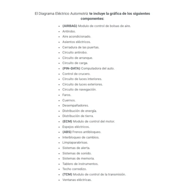 El Diagrama Eléctrico Automotriz te incluye la gráfica de los siguientes componentes:
