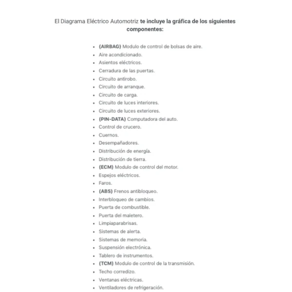 El Diagrama Eléctrico Automotriz te incluye la gráfica de los siguientes componentes: