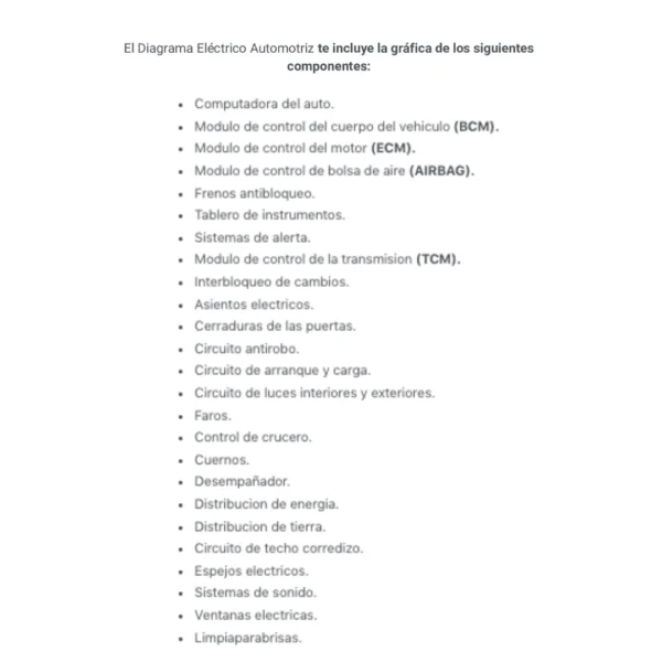 El Diagrama Eléctrico Automotriz te incluye la gráfica de los siguientes componentes: