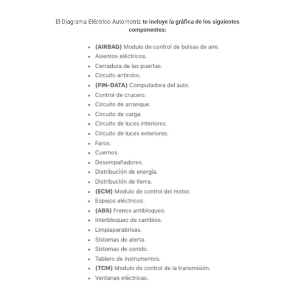 El Diagrama Eléctrico Automotriz te incluye la gráfica de los siguientes componentes: