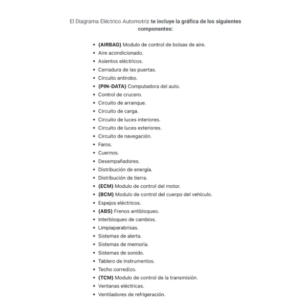 El Diagrama Eléctrico Automotriz te incluye la gráfica de los siguientes componentes: