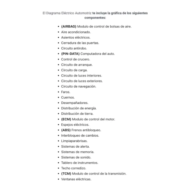 El Diagrama Eléctrico Automotriz te incluye la gráfica de los siguientes componentes: