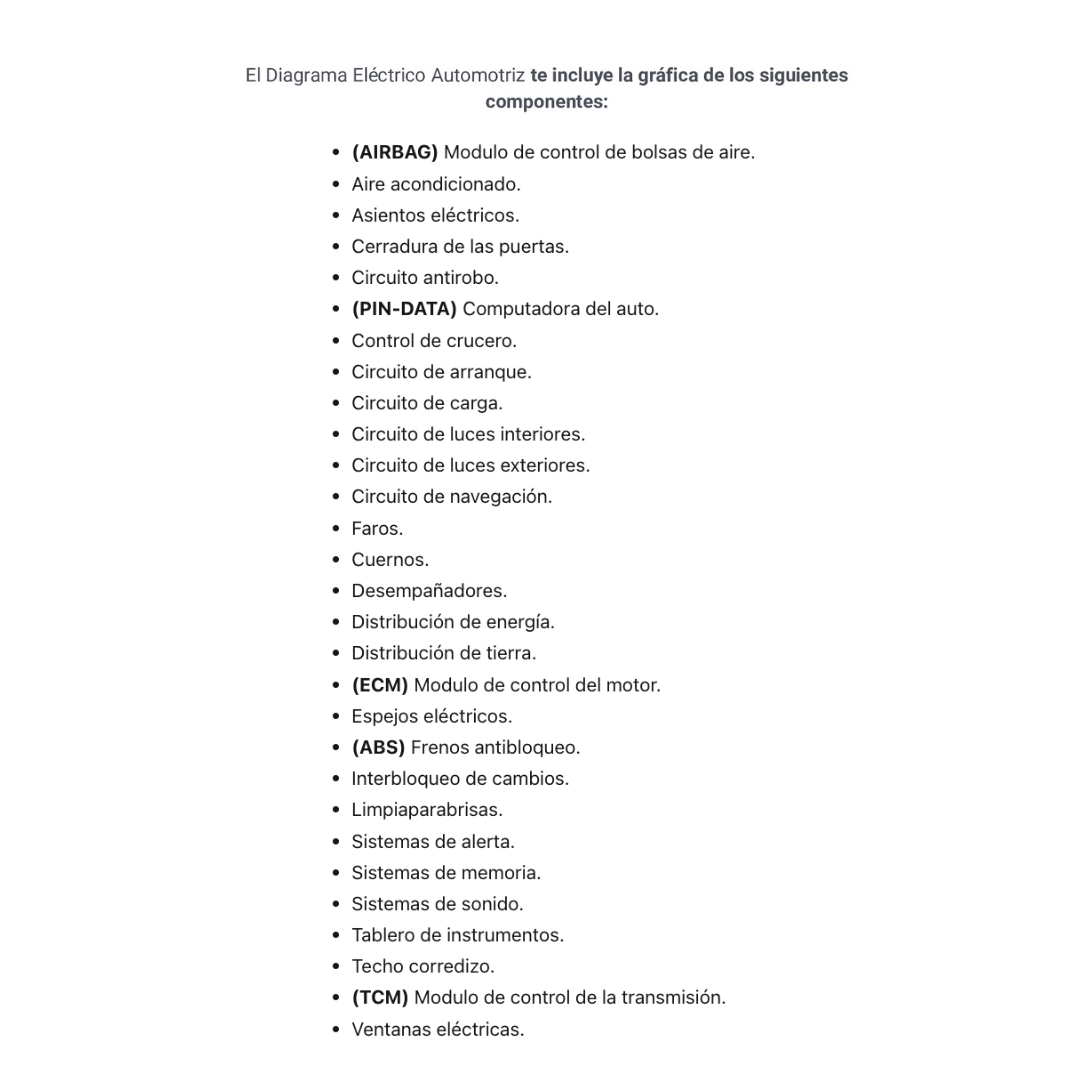 El Diagrama Eléctrico Automotriz te incluye la gráfica de los siguientes componentes: