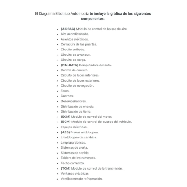 El Diagrama Eléctrico Automotriz te incluye la gráfica de los siguientes componentes: