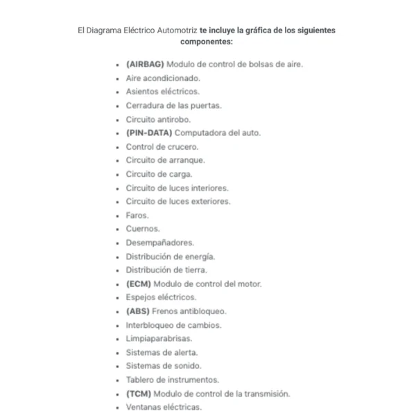 El Diagrama Eléctrico Automotriz te incluye la gráfica de los siguientes componentes: