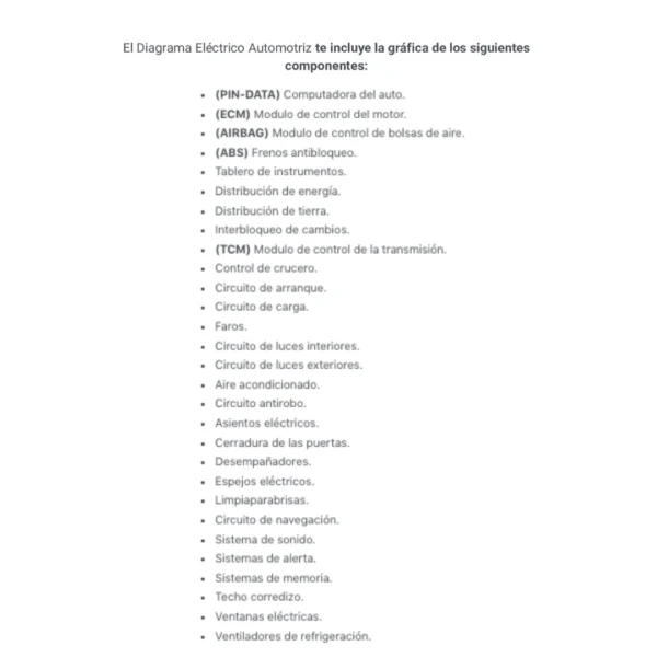 El Diagrama Eléctrico Automotriz te incluye la gráfica de los siguientes componentes: