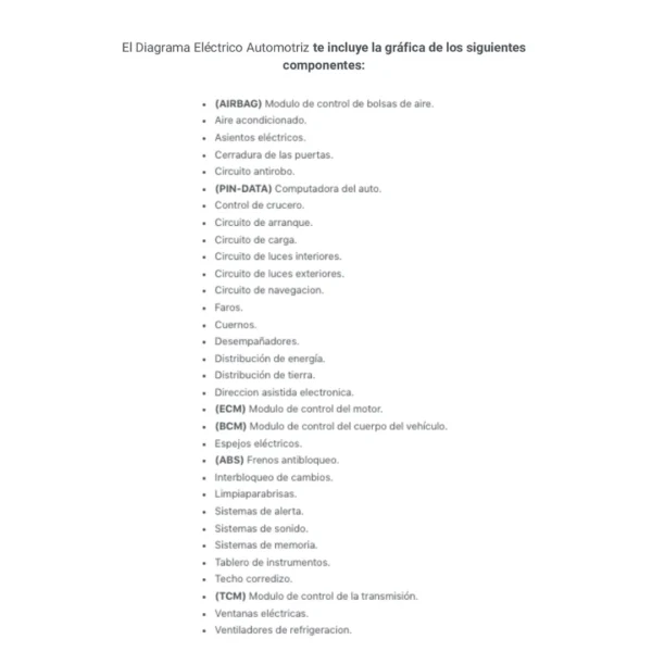 El Diagrama Eléctrico Automotriz te incluye la gráfica de los siguientes componentes:
