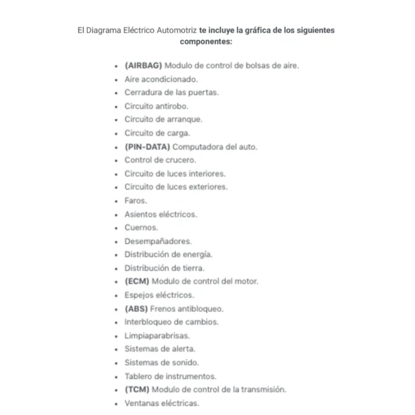 El Diagrama Eléctrico Automotriz te incluye la gráfica de los siguientes componentes: