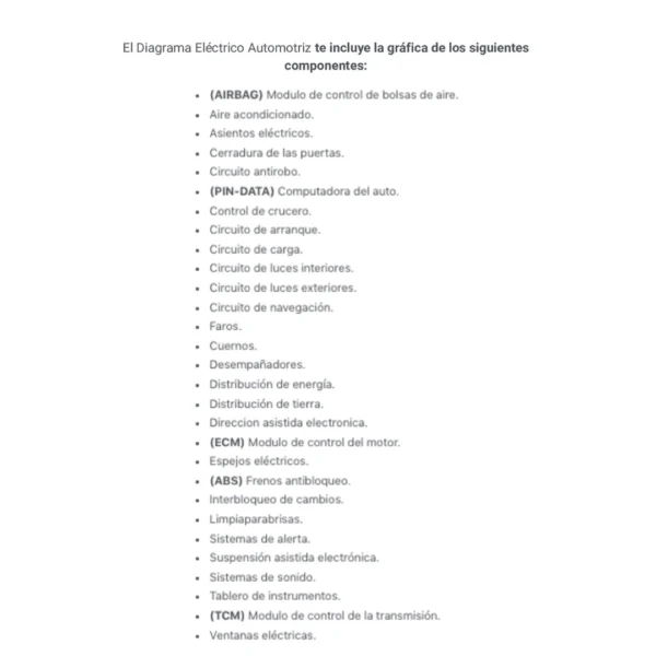 El Diagrama Eléctrico Automotriz te incluye la gráfica de los siguientes componentes:
