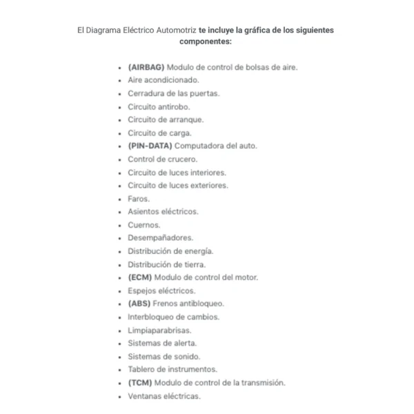 El Diagrama Eléctrico Automotriz te incluye la gráfica de los siguientes componentes: