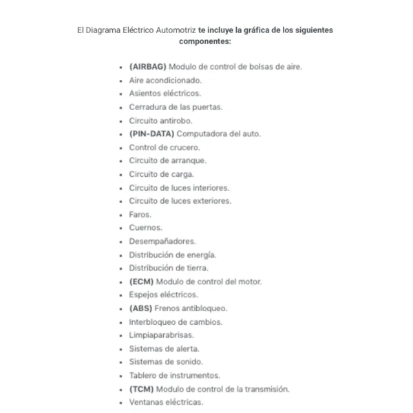 El Diagrama Eléctrico Automotriz te incluye la gráfica de los siguientes componentes: