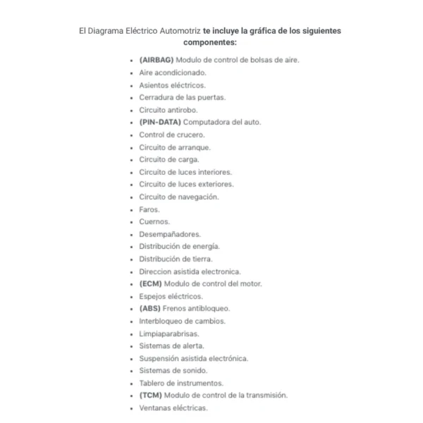 El Diagrama Eléctrico Automotriz te incluye la gráfica de los siguientes componentes: