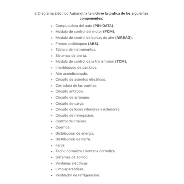 El Diagrama Eléctrico Automotriz te incluye la gráfica de los siguientes componentes: