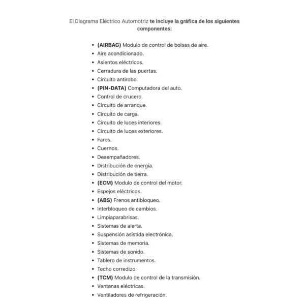 El Diagrama Eléctrico Automotriz te incluye la gráfica de los siguientes componentes: