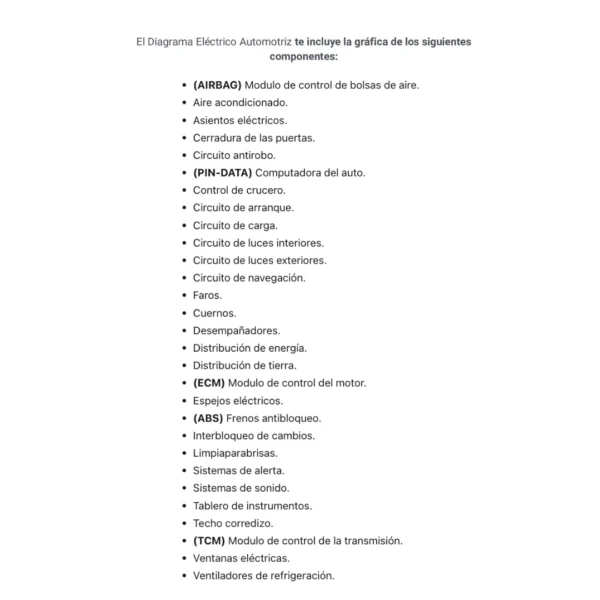 El Diagrama Eléctrico Automotriz te incluye la gráfica de los siguientes componentes: