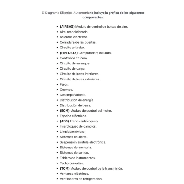 El Diagrama Eléctrico Automotriz te incluye la gráfica de los siguientes componentes: