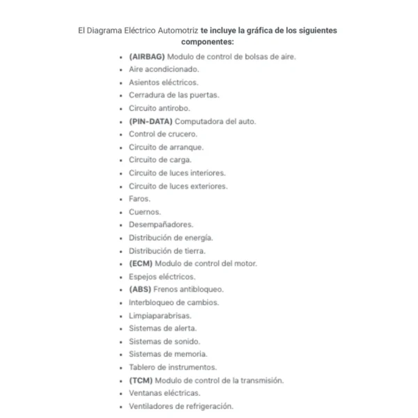 El Diagrama Eléctrico Automotriz te incluye la gráfica de los siguientes componentes: