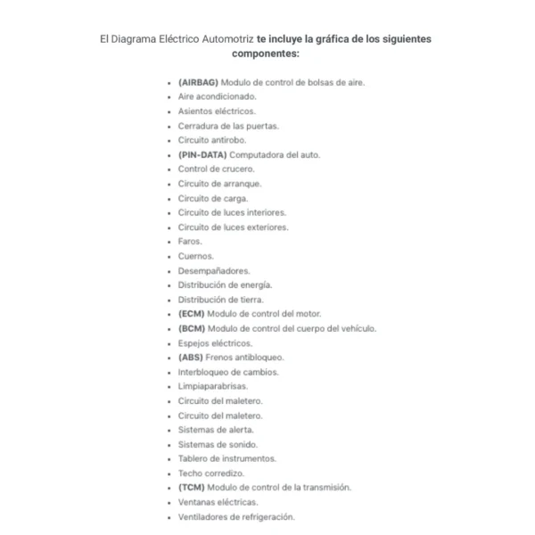 El Diagrama Eléctrico Automotriz te incluye la gráfica de los siguientes componentes: