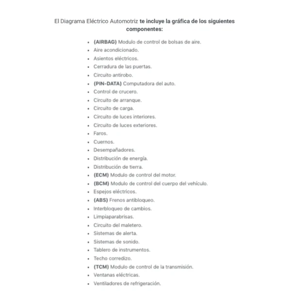 El Diagrama Eléctrico Automotriz te incluye la gráfica de los siguientes componentes: