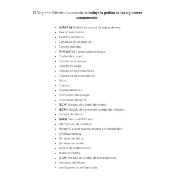 El Diagrama Eléctrico Automotriz te incluye la gráfica de los siguientes componentes: