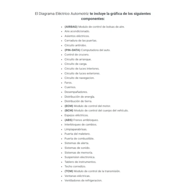El Diagrama Eléctrico Automotriz te incluye la gráfica de los siguientes componentes: