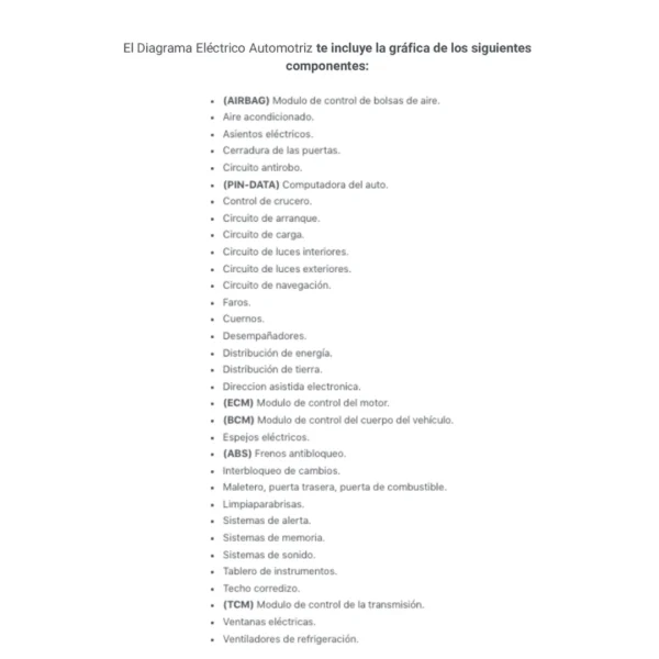 El Diagrama Eléctrico Automotriz te incluye la gráfica de los siguientes componentes: