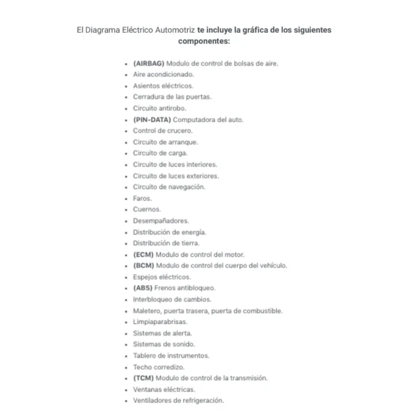 El Diagrama Eléctrico Automotriz te incluye la gráfica de los siguientes componentes: