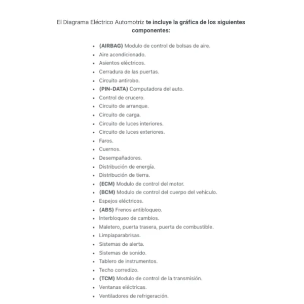 El Diagrama Eléctrico Automotriz te incluye la gráfica de los siguientes componentes: