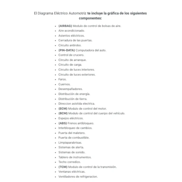 El Diagrama Eléctrico Automotriz te incluye la gráfica de los siguientes componentes: