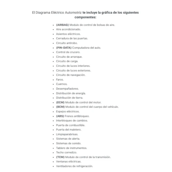 El Diagrama Eléctrico Automotriz te incluye la gráfica de los siguientes componentes: