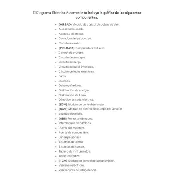 El Diagrama Eléctrico Automotriz te incluye la gráfica de los siguientes componentes: