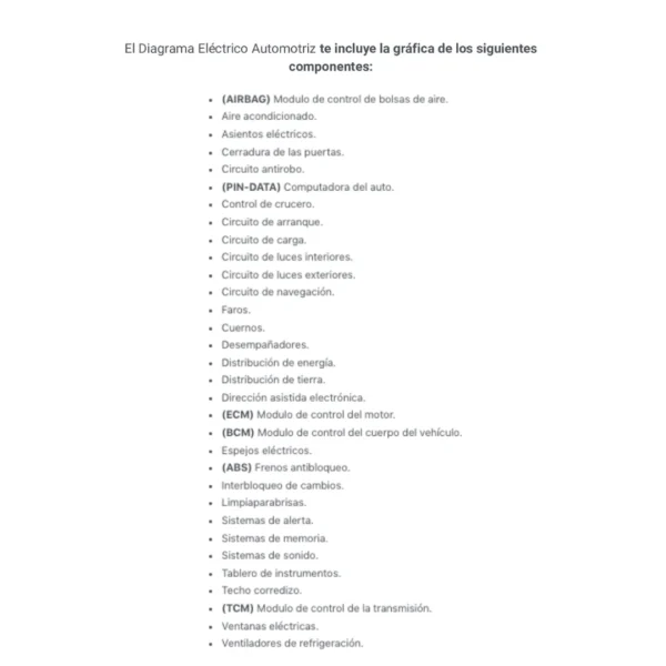 El Diagrama Eléctrico Automotriz te incluye la gráfica de los siguientes componentes: