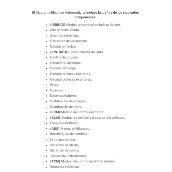 El Diagrama Eléctrico Automotriz te incluye la gráfica de los siguientes componentes: