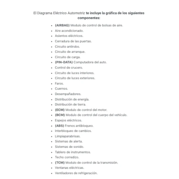 El Diagrama Eléctrico Automotriz te incluye la gráfica de los siguientes componentes: