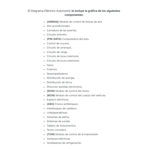 El Diagrama Eléctrico Automotriz te incluye la gráfica de los siguientes componentes: