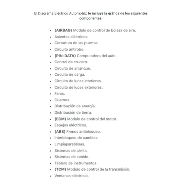 El Diagrama Eléctrico Automotriz te incluye la gráfica de los siguientes componentes: