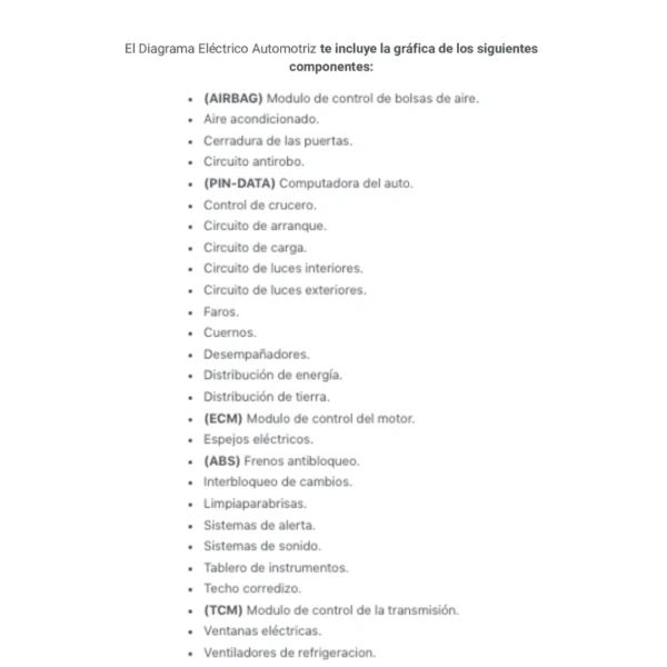 El Diagrama Eléctrico Automotriz te incluye la gráfica de los siguientes componentes: