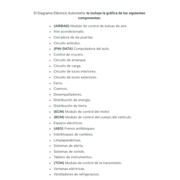 El Diagrama Eléctrico Automotriz te incluye la gráfica de los siguientes componentes: