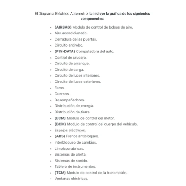 El Diagrama Eléctrico Automotriz te incluye la gráfica de los siguientes componentes: