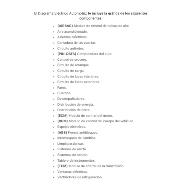 El Diagrama Eléctrico Automotriz te incluye la gráfica de los siguientes componentes: