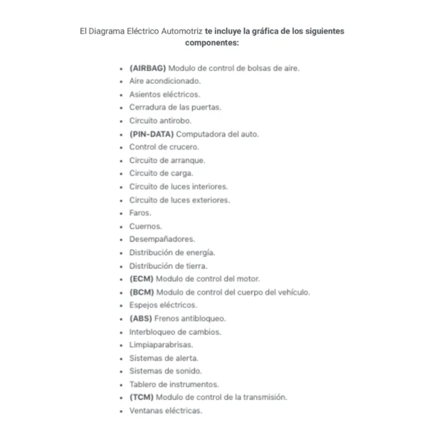 El Diagrama Eléctrico Automotriz te incluye la gráfica de los siguientes componentes: