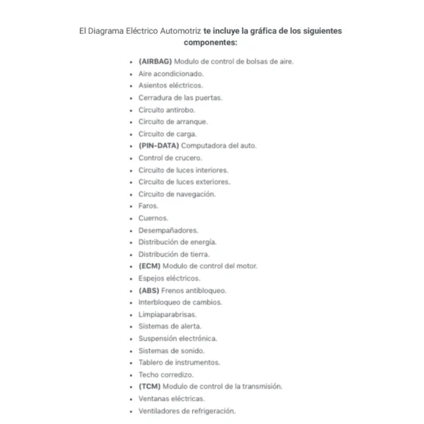 El Diagrama Eléctrico Automotriz te incluye la gráfica de los siguientes componentes: