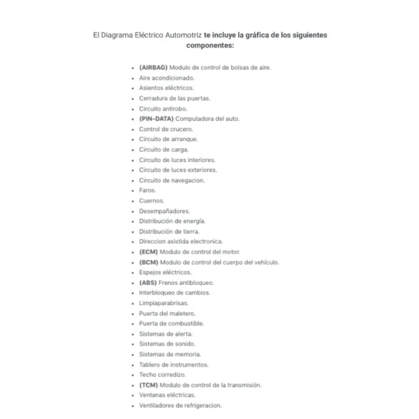 El Diagrama Eléctrico Automotriz te incluye la gráfica de los siguientes componentes: