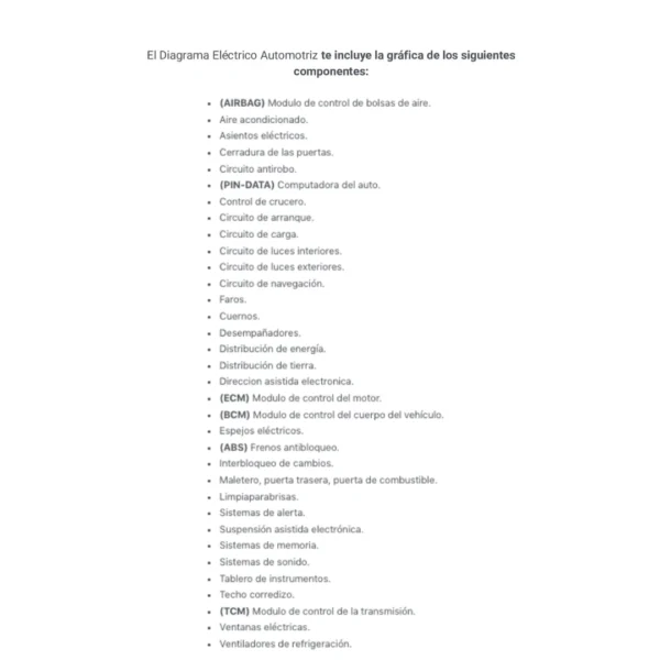 El Diagrama Eléctrico Automotriz te incluye la gráfica de los siguientes componentes: