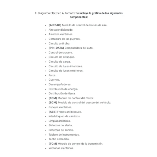 El Diagrama Eléctrico Automotriz te incluye la gráfica de los siguientes componentes: