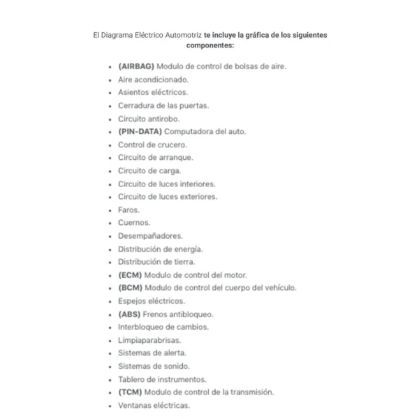 El Diagrama Eléctrico Automotriz te incluye la gráfica de los siguientes componentes: