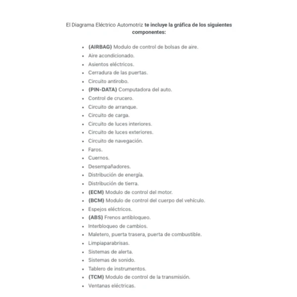 El Diagrama Eléctrico Automotriz te incluye la gráfica de los siguientes componentes: